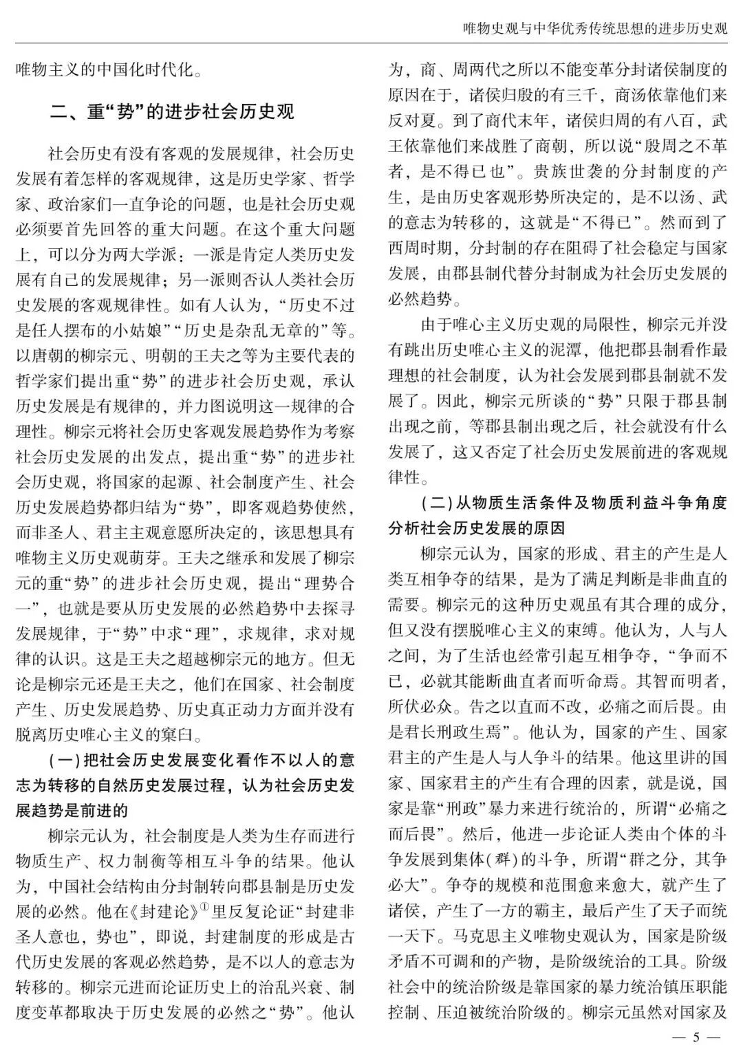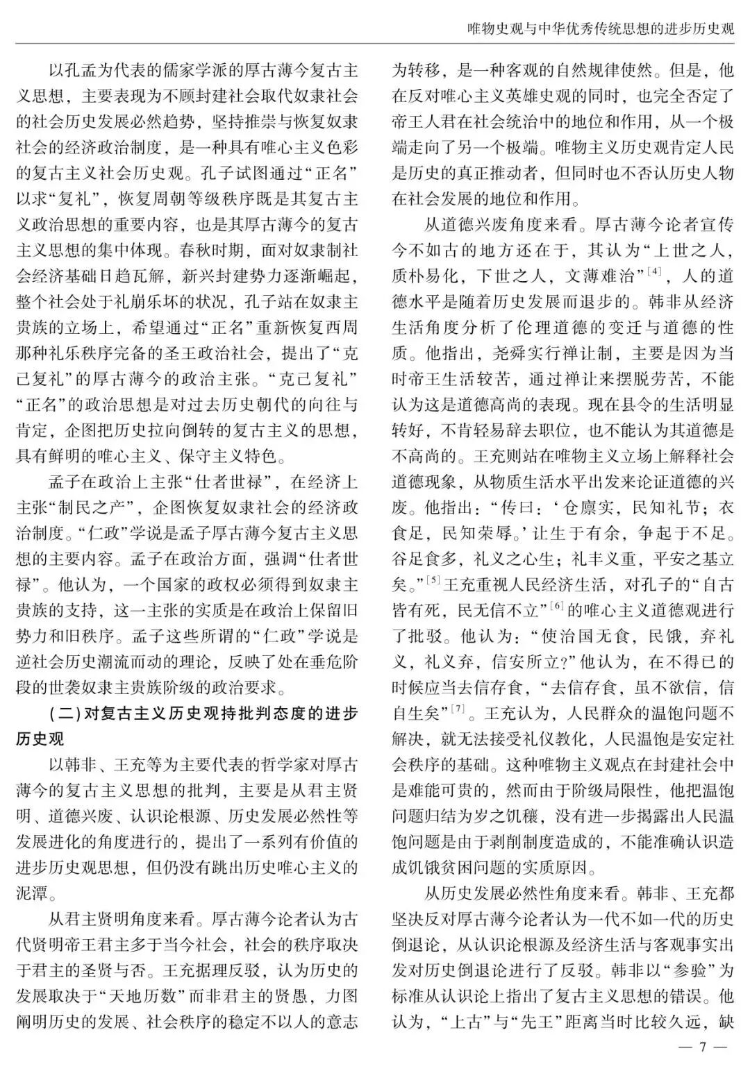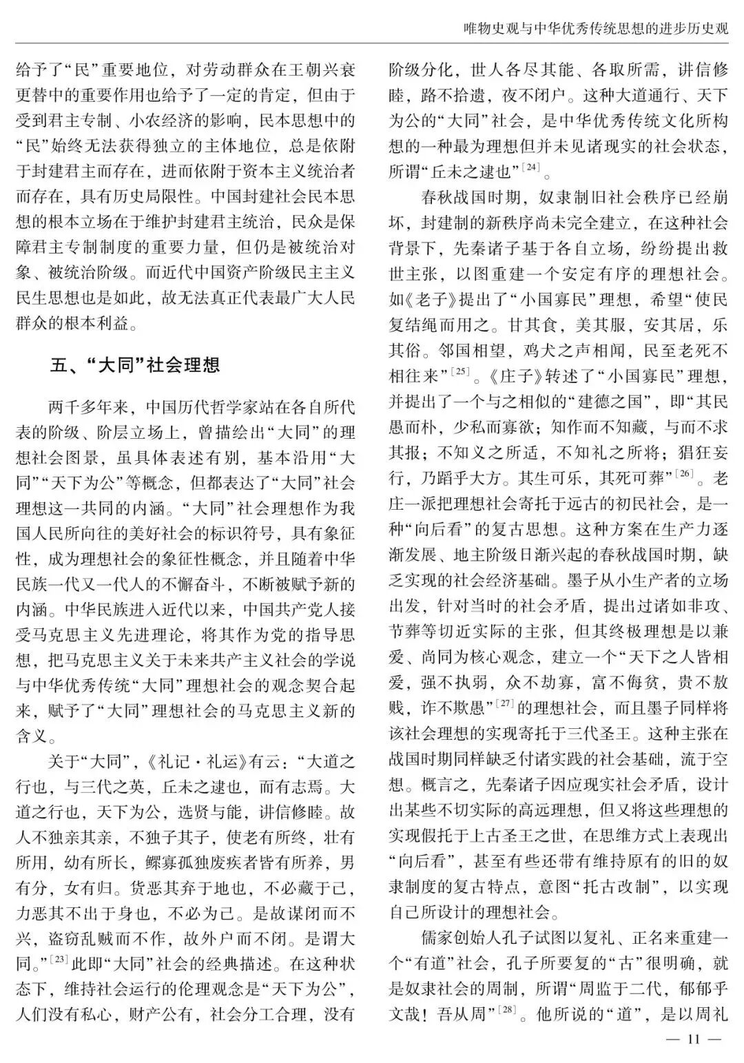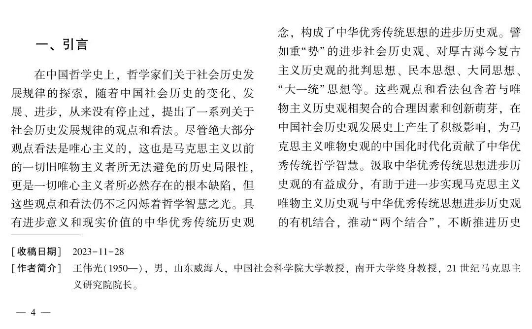 在中国哲学史上,哲学家们提出了一系列关于社会历史发展规律的观点和看法。中华优秀传统历史观念构成了中华优秀传统思想的进步历史观。中华优秀传统思想的进步历史观包括重“势”的进步社会历史观、对厚古薄今复古主义历史观的批判思想、民本思想、大同思想、“大一统”思想等,蕴含着与唯物史观相契合的合理因素和创新萌芽,在中国社会历史观发展史上产生了积极影响,为马克思主义唯物史观的中国化时代化贡献了中华优秀传统哲学智慧。汲取中华优秀传统思想进步历史观的有益成分,有助于进一步实现唯物史观与中华优秀传统思想进步历史观的有机结合,在“两个结合”中继续推进马克思主义中国化时代化。