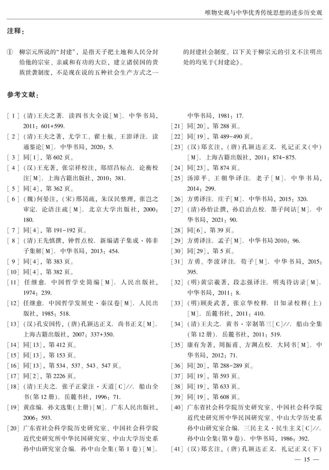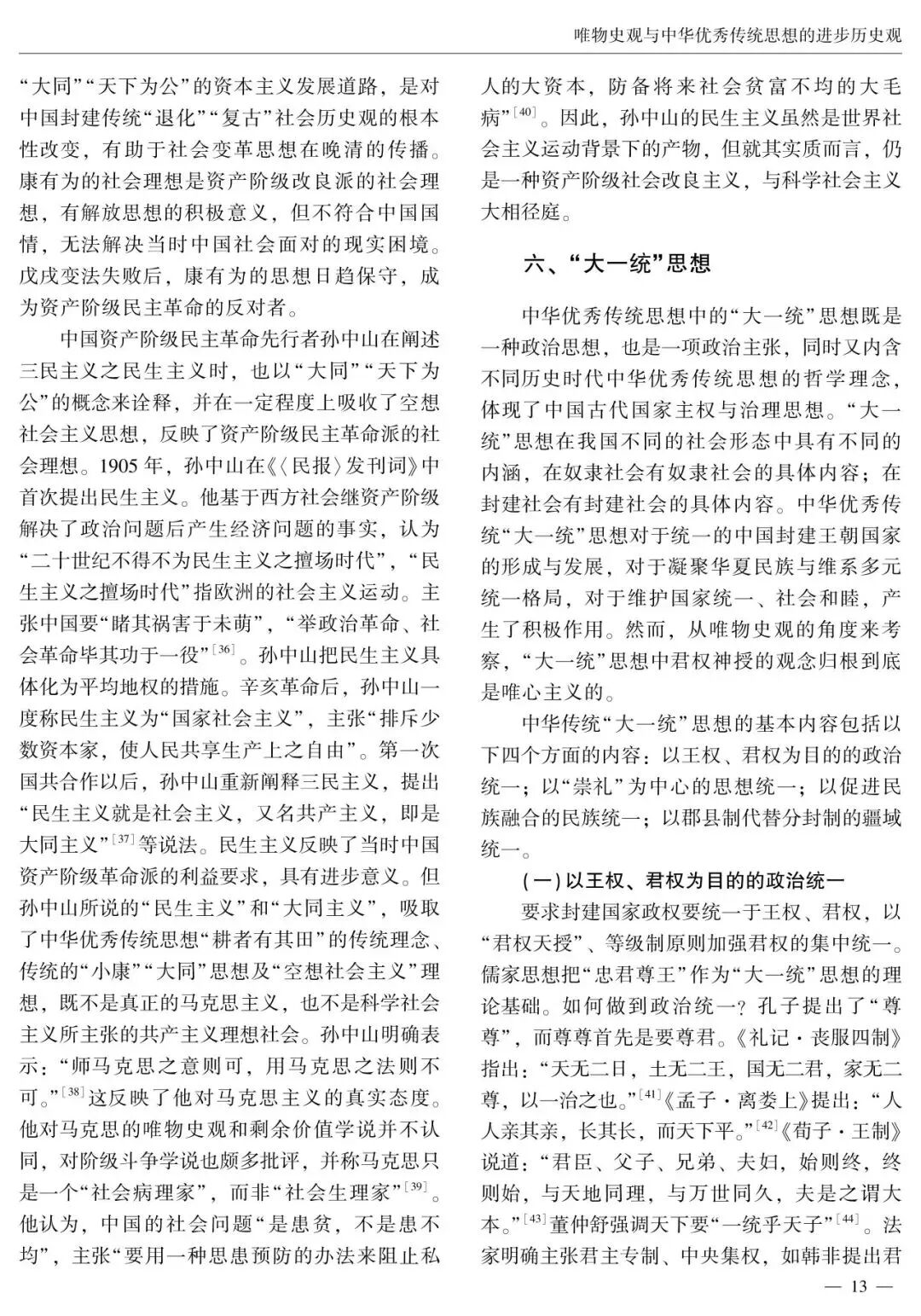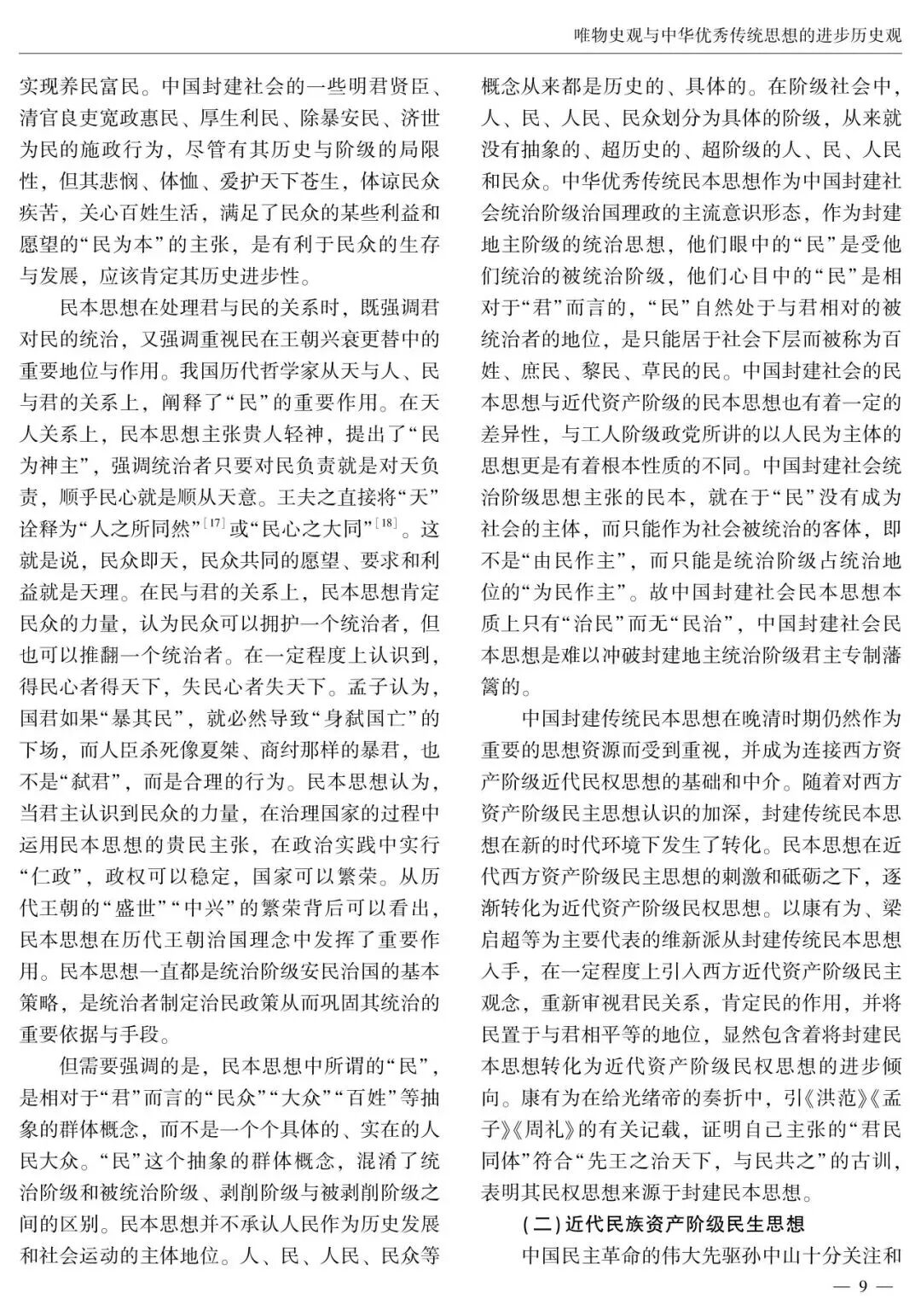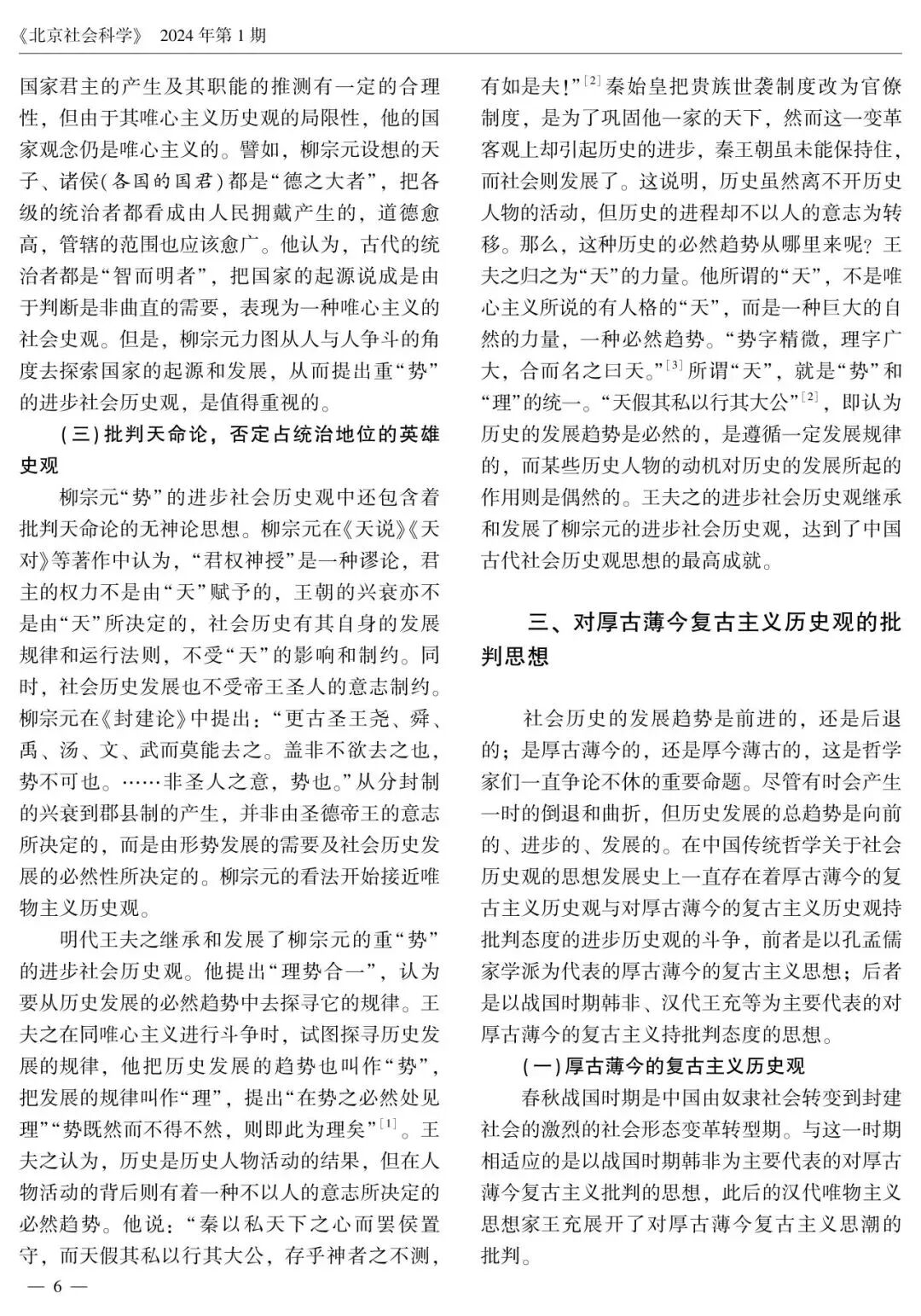 在中国哲学史上,哲学家们提出了一系列关于社会历史发展规律的观点和看法。中华优秀传统历史观念构成了中华优秀传统思想的进步历史观。中华优秀传统思想的进步历史观包括重“势”的进步社会历史观、对厚古薄今复古主义历史观的批判思想、民本思想、大同思想、“大一统”思想等,蕴含着与唯物史观相契合的合理因素和创新萌芽,在中国社会历史观发展史上产生了积极影响,为马克思主义唯物史观的中国化时代化贡献了中华优秀传统哲学智慧。汲取中华优秀传统思想进步历史观的有益成分,有助于进一步实现唯物史观与中华优秀传统思想进步历史观的有机结合,在“两个结合”中继续推进马克思主义中国化时代化。