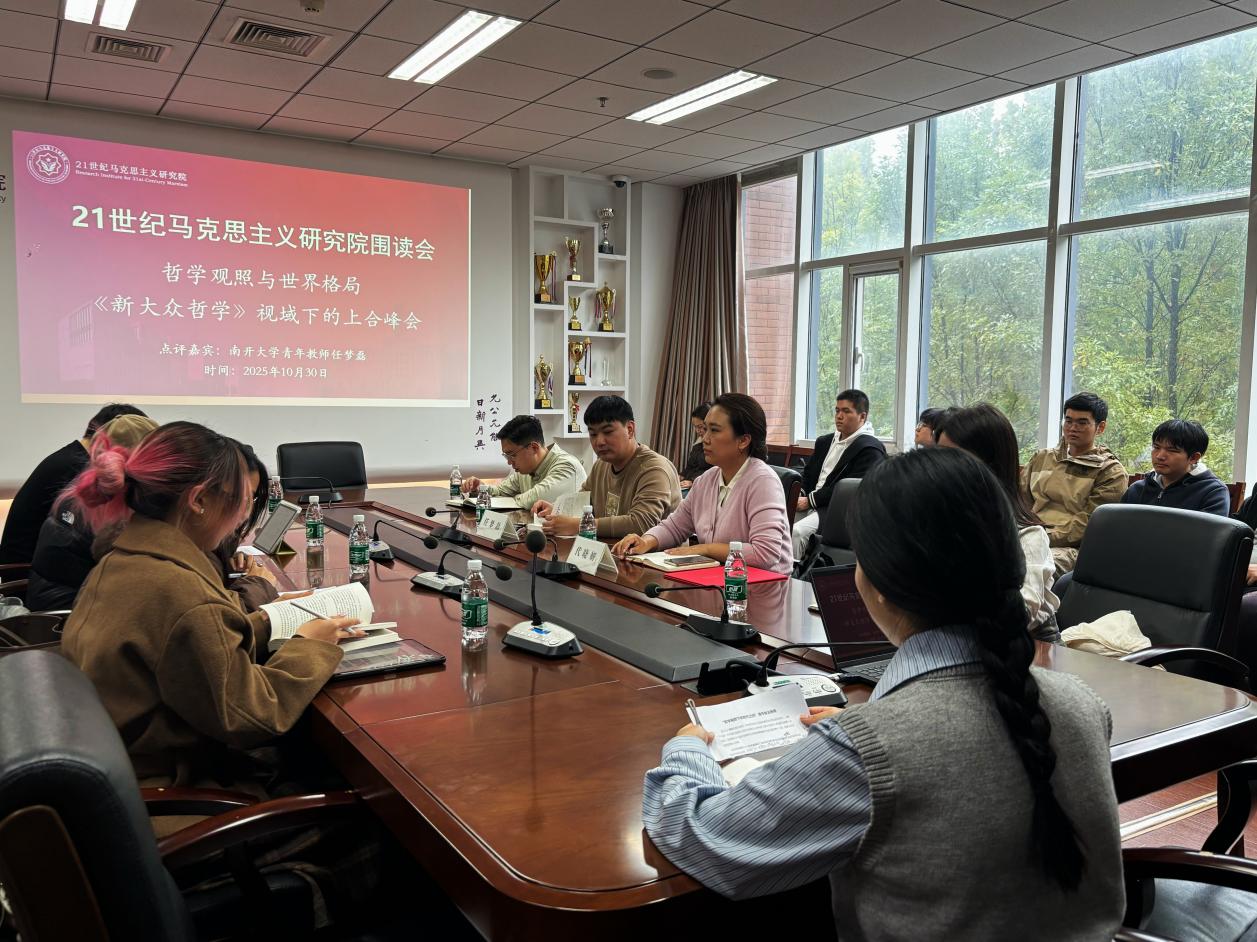 为进一步提升21世纪马克思主义研究院学生研究员团队理论水平,引导学生学好哲学、用好哲学,新学期第一期“哲学视野下的时代之问”读书会于10月30日下午在马克思主义学院顺利举办。本次读书会由学生研究员王颖主持,以“《哲学观照与世界格局:〈新大众哲学〉视域下的上合峰会》”为主题,特邀马克思主义学院青年教师任梦磊担任点评嘉宾,21世纪马克思主义学院办公室副主任代晓妍等20余名师生共同参与研讨。