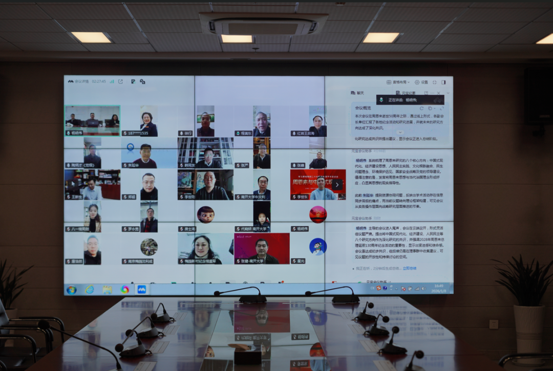 座谈会以腾讯会议方式召开,主会场设在位于周恩来家乡江苏淮安的恩来干部学院,由杨明伟会长主持。周恩来研究会副会长潘敬国、牛文利、张严、罗永宽、程美东、唐凤红、王启海、盛军、韩同友、祁素娟、郑超以及张亚青(派代表)、杨颂周(派代表)出席,在线的近50位理事参加会议。联合主办单位代表南开大学党委副书记、南开大学周恩来和中共党史人物研究中心主任牛文利,南开大学原副校长、南开大学马克思主义学院院长王新生,恩来干部学院常务副院长黄少基、副院长梁文凤等全程参会并发言。